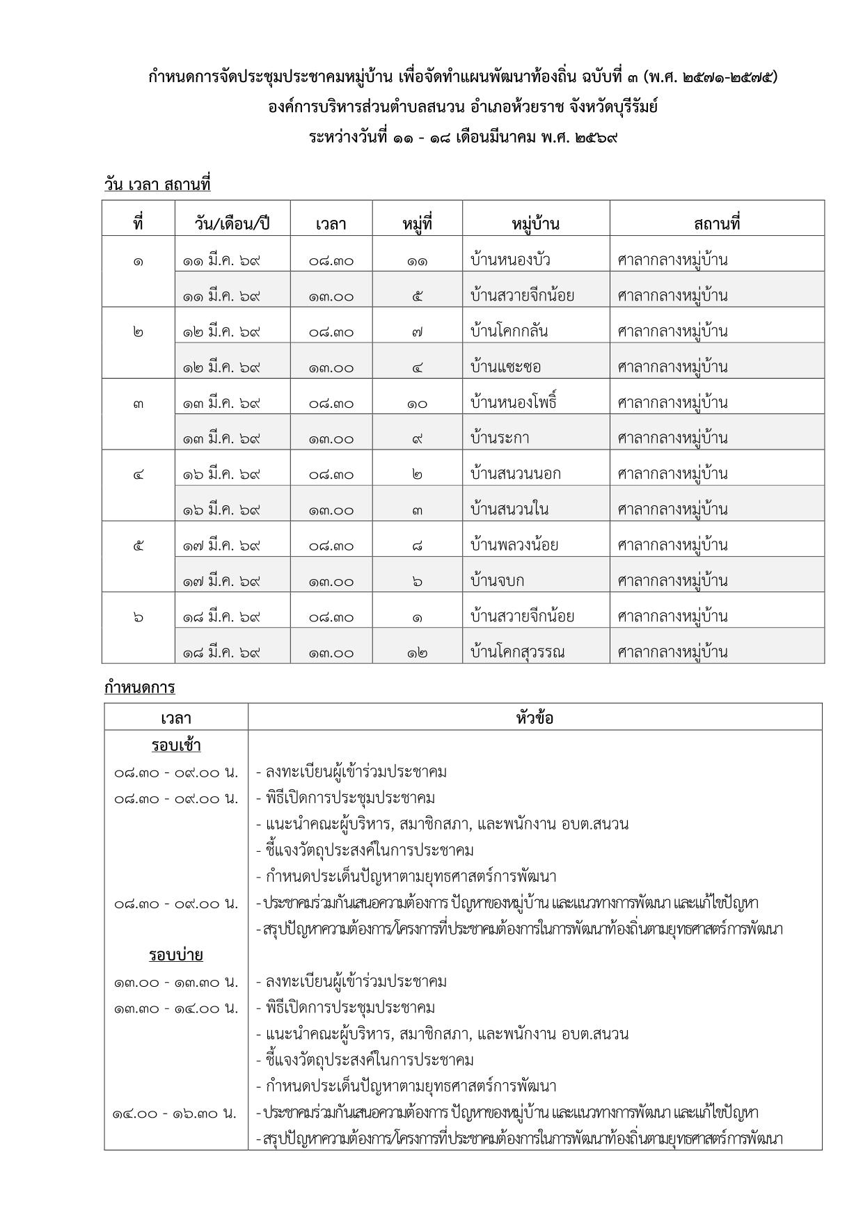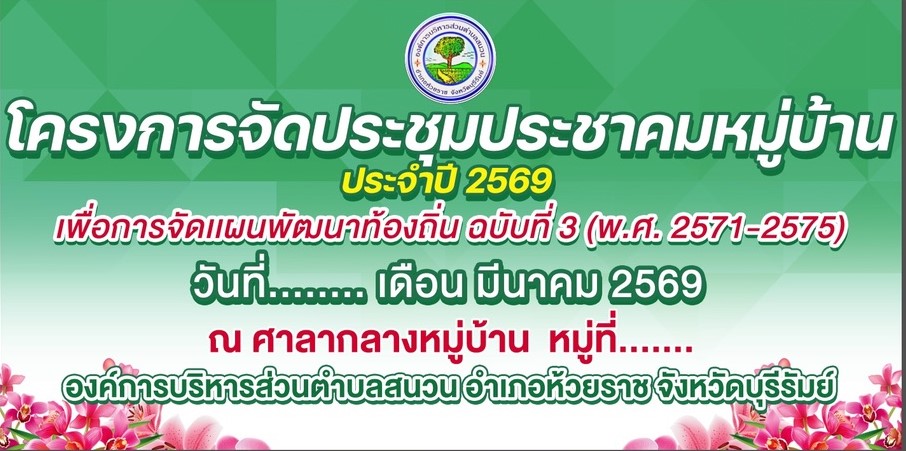 ขอเชิญร่วมประชุมประชาคมหมู่บ้าน ประจำปีงบประมาณ พ.ศ. 2569 องค์การบริหารส่วนตำบลสนวน เพื่อส่งเสริมสนับสนุนให้ประชาชนมีส่วนร่วมในการเสนอปัญหา ความต้องการ ตลอดจนกำหนดประเด็นหลักการพัฒนา แ ละบรรจุในแผนพัฒนาท้องถิ่น ฉบับที่ 3 (พ.ศ. 2571-2575)